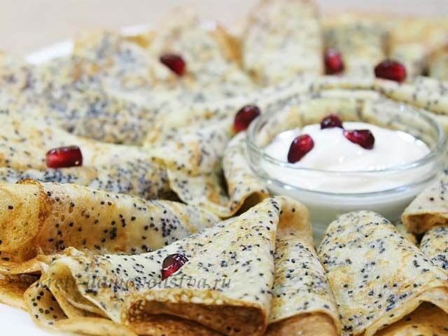 Пока они горячие подавайте их сразу же на стол. Я подаю со сметаной и украшаю зернышками граната. Но можно подать с тем, что больше любите. Конечно же вкусно будет и с медом, и со сгущенкой и с вареньем.