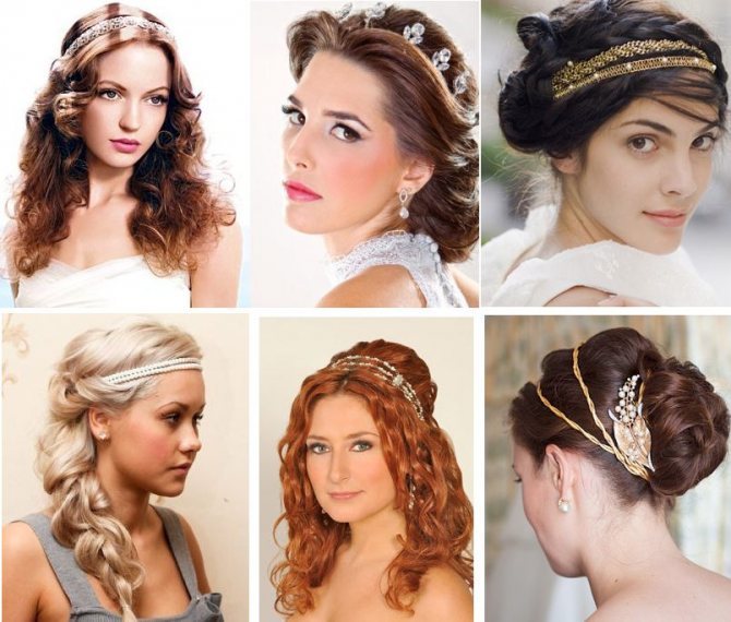 Для создания винтажного образа потребуется тонкая повязка из кожи, ткани или металла. Уместно будет декорирование драгоценными камнями или жемчугом. Классическим вариантом является ношение поверх волос выше лба.