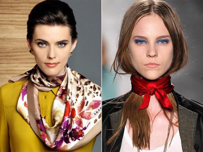 Существует множество способов украшения платком области шеи. Шарфик можно легко превратить в бусы: достаточно сделать на нем несколько узелков. Шелковый платок можно завязать как мужской галстук — просто проденьте под воротник блузки и завяжите как галстук.