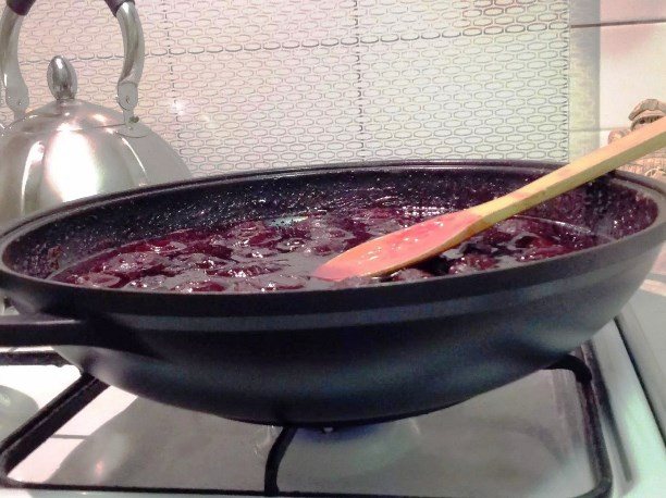 Самая лучшая посуда для варки варенья – низкая, широкая, с толстым дном. Я завела себе идеальную посудину: казан с керамическим покрытием. В него как раз вмещается 2 кг плодов и нужное количество воды и сахара.